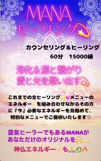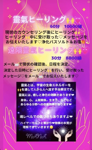 風の時代に入り、エネルギーの重要性を感じる方が増えてきております。エネルギーは目には見えませんが、ヒーリング中に身体がポカポカしたり、浄化の咳が出たり、涙が流れたり、さまざまな反応が起こります。ヒーリング後は、心の安定や、身体が軽くなったり、浅い呼吸から深い呼吸ができるようになったり、視界がはっきりしたりとそれぞれに変化を感じて頂いております。エネルギーで、心と身体と魂を整えていきます。